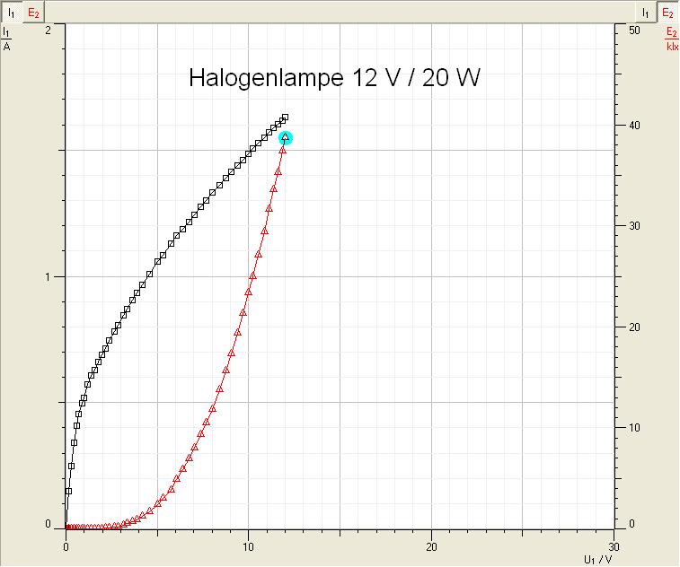 Nehmen Sie die U-I-Kennlinie einer Halogenlampe (12 V / 20 W) auf! Messen Sie die Beleuchtungsstärke in Abhängigkeit von der angelegten Spannung. Planen Sie dazu einen Versuch und führen Sie ihn durch!