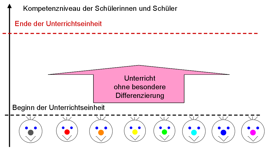Alle Schülerinnen und Schüler- befinden sich vor der Unterrichtseinheit auf dem gleichem Kompetenzniveau. Dies gilt für jeden Kompetenzbereich.