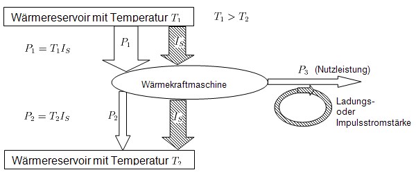 Begründe, warum die berechneten (idealen) Wirkungsgrade von Wärmekraftmaschinen größer als die realen Wirkungsgrade sind. Erweitere dazu zunächst die Skizze einer idealen Wärmekraftmaschine (siehe unten) um geeignete
