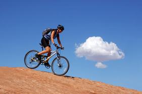 Eine Mountainbikerin steht mit ihrem Bike an einem Abhang. Wenn sie den Bremshebel los lässt und ihre Füße auf die Pedale setzt, beginnt sie den Hang hinunter zu rollen. Offensichtlich wird sie entlang des Hangs beschleunigt, da sie immer schneller wird. Schnell zieht sie wieder am Bremshebel.