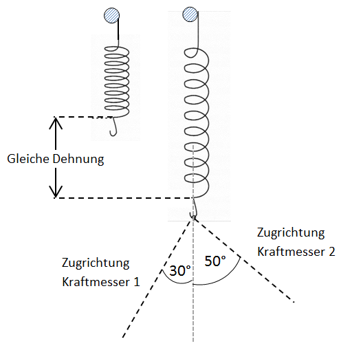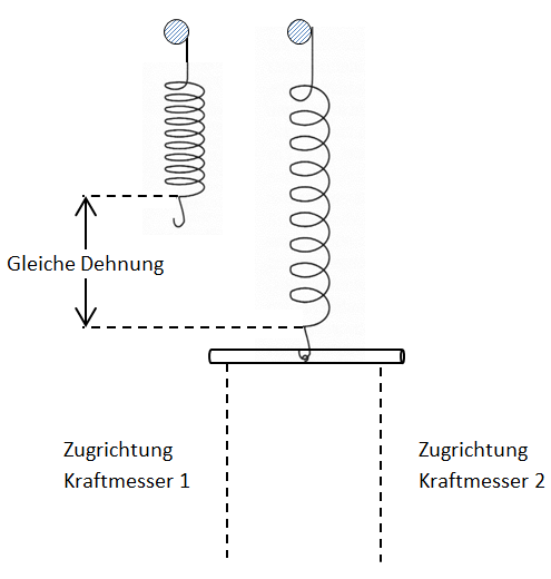 - Nehmt einen zweiten Kraftmesser dehnt nun mit beiden Kraftmessern durch Zug die Feder wieder auf die gleiche Länge, indem ihr Notiert jeweils die Kraftbeträge, die die beiden Kraftmesser anzeigen.