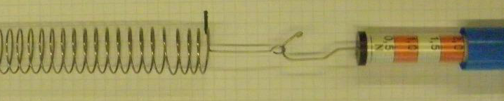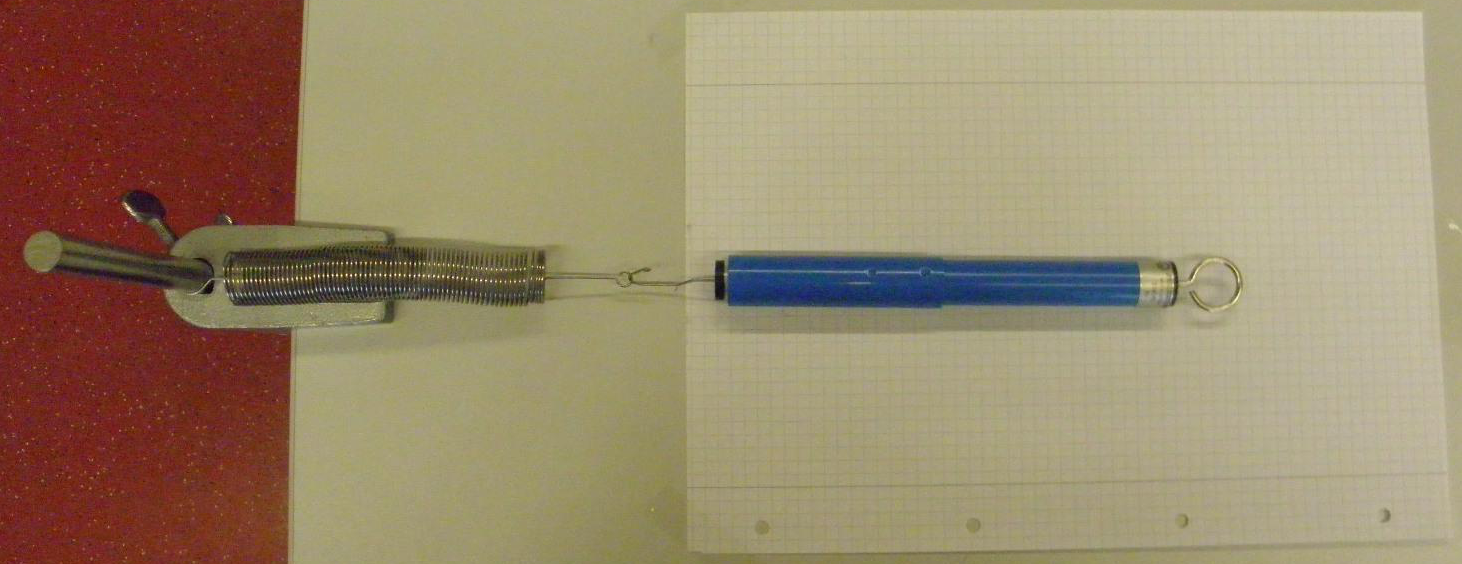 - Dehnt die Schraubenfeder mithilfe des Kraftmessers, so dass der Kraftmesser die Kraft 2 N anzeigt. Markiert auf einem darunter liegenden Blatt, wie weit die Feder gedehnt wurde.