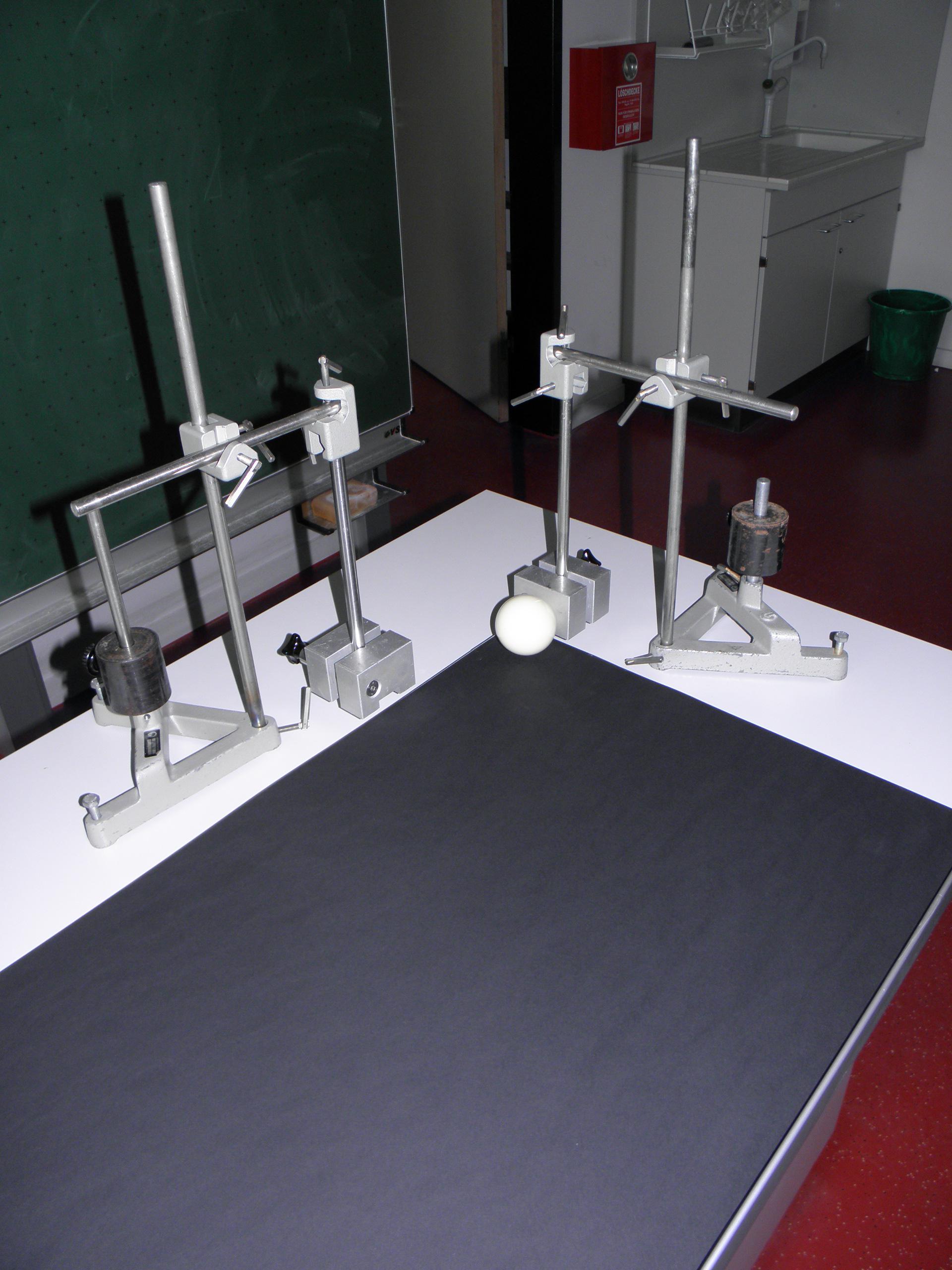 kann ein Stoßversuch gemäß neben stehender Anordnung durchgeführt werden. Hierzu werden mit Stativmaterial zwei Stoßpendel aufgebaut. Die Muffe an der Aufhängung bleibt dabei offen, so dass möglichst wenige Reibung das