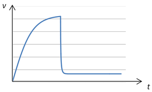 - Die resultierende Kraft und damit verbunden auch die Beschleunigung nehmen mit zunehmender Fallgeschwindigkeit ab, bis schließlich eine konstante Fallgeschwindigkeit von ca. 55 m/s erreicht wird. Nach Öffnen des Schirms nimmt die Luftwiderstandskraft stark zu und die Bewegung wird so lange abgebremst, bis wieder ein Gleichgewicht zwischen Luftwiderstandskraft und Gewichtskraft herrscht.