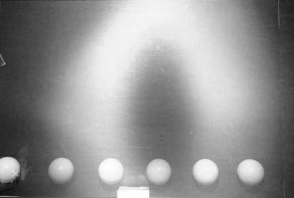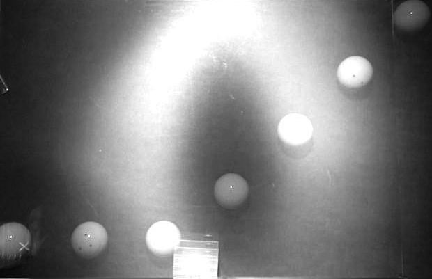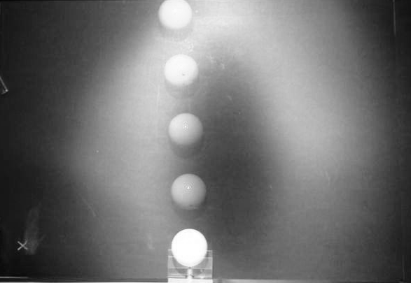 Im Folgenden siehst du drei Stroboskopaufnahmen unserer Kugelbewegung. Das Stroboskop hat dabei pro Sekunde drei Lichtblitze erzeugt. Die Kugel selbst hat einen Durchmesser von 6 cm.