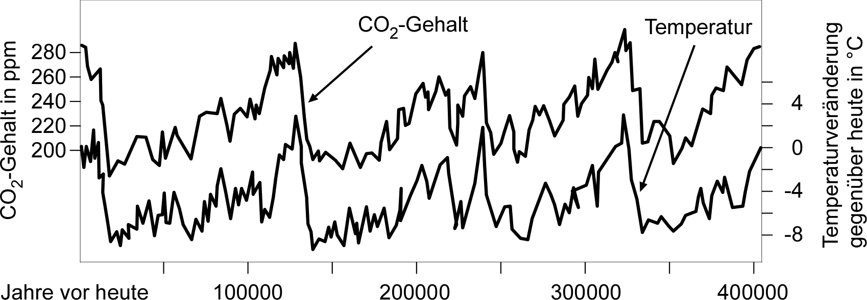 - Der Verlauf der Kurven legt die Vermutung nahe, dass ein Zusammenhang zwischen CO 2 -Gehalt und Temperatur besteht.