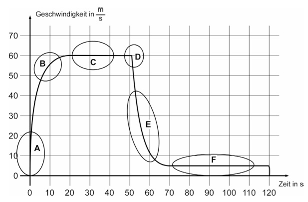 Das abgebildete Diagramm beschreibt die Bewegung eines Fallschirmspringers. Das Diagramm lässt sich in unterschiedliche Phasen A, B, C, D, E und F einteilen.