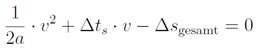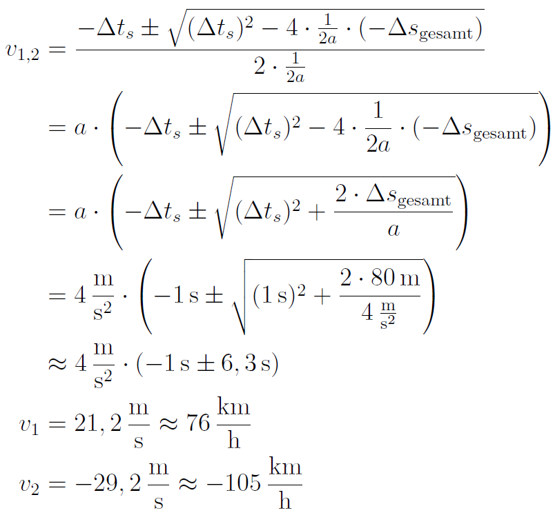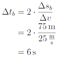 Die Bremszeit Δ t b ergibt sich wieder aus der Gleichung v = a ·Δ t b , die man nach Δ t b auflöst. Setzt man dies ein, so erhält man:
