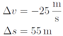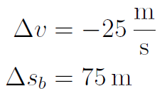 Der Anhalteweg beträgt 100 m. Da 25 m in der Schrecksekunde zurückgelegt wurden, bleiben noch 75 m für den Bremsweg (Index b) übrig. Die Fahrerin muss also in 75 m von 25 m/s auf 0 m/s herunterbremsen. Gesucht ist dafür die Verzögerung a .