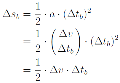 Die Formel Δ s b = ½· a ·(Δ t b ) 2 nützt zunächst nichts, da Δ t b unbekannt ist. Also muss man zunächst die Bremszeit Δ t b bestimmen. Die beiden Formeln Δ s b = ½· a ·(Δ t b ) 2 und Δ v = a ·Δ t b zusammen helfen aber weiter: Löst man die zweite Formel nach a auf und setzt sie in die erste Formel ein, so erhält man
