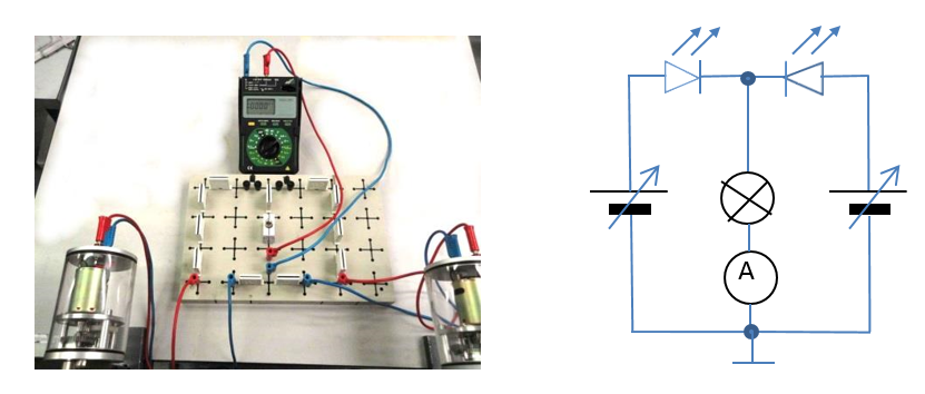 Zwei „Dynamot“-Generatoren mit Kurbeln werden gemäß der Abbildung über je eine rote LED (Light Emission Diode) an eine Glühlampe (6V/0,05A) angeschlossen.