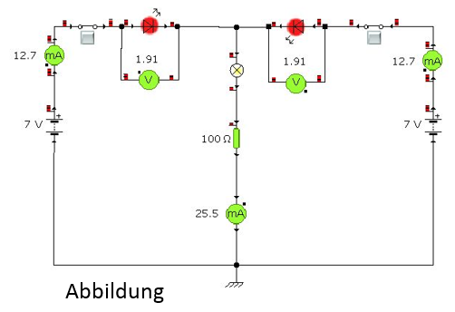Modelliere die Schaltung so, dass du bei geschlossenen Schaltern zunächst den Wert der linken Spannungsquelle langsam vergrößerst. Beschreibe den jeweiligen Effekt auf die Stromstärke durch die Lampe und auf die Helligkeit der LEDs.