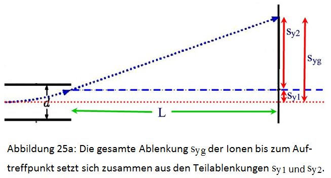 Die gesamte Ablenkung syg ergibt sich nach Abbildung 25a aus zwei Anteilen: Die Ablenkung sy1 im Kondensator und die Ablenkung sy2 durch die anschließende Querbewegung der Ionen.