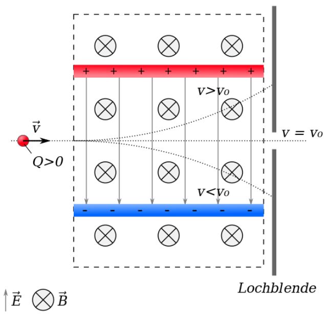 Positiv geladene Kohlenstoffionen haben die zu den Feldern in Abb. 36 passende Geschwindigkeit, so dass sie den Geschwindigkeitsfilter unabgelenkt durchfliegen. Andere positiv geladene Teilchen, die aber das gleiche Verhältnis q/m haben wie die Kohlenstoffionen, haben aber die gleiche Geschwindigkeit.
