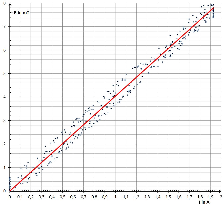 Abb. 37: Die magnetische Flussdichte der Helmholtzspule. Die rote Gerade stellt die Ausgleichsgerade dar. Zum Vergrößern bitte die Abbildung anklicken. Bildquelle: Dr. Rolf Piffer