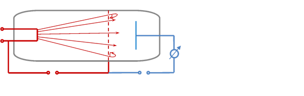Elektronen bewegen sich im Vakuum ungestört zum Anodennetz N. Ist UB >2V, können sie gegen die zwischen N und A liegende Gegenspannung UG=2V anlaufen. Nur dann erreichen sie A und das Messgerät registriert den Strom IA. Dieser steigt erst bei UB>2V monoton mit der SpannungUB.