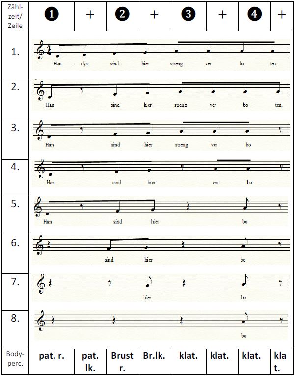 - Bodypercussion: Markiert leise mit der Ferse den Grundschlag. Schlagt jede Zeile der Bodypercussion viermal.