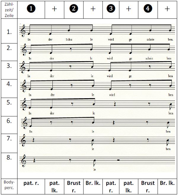 - Bodypercussion: Markiert leise mit der Ferse den Grundschlag. Schlagt jede Zeile der Bodypercussion viermal.