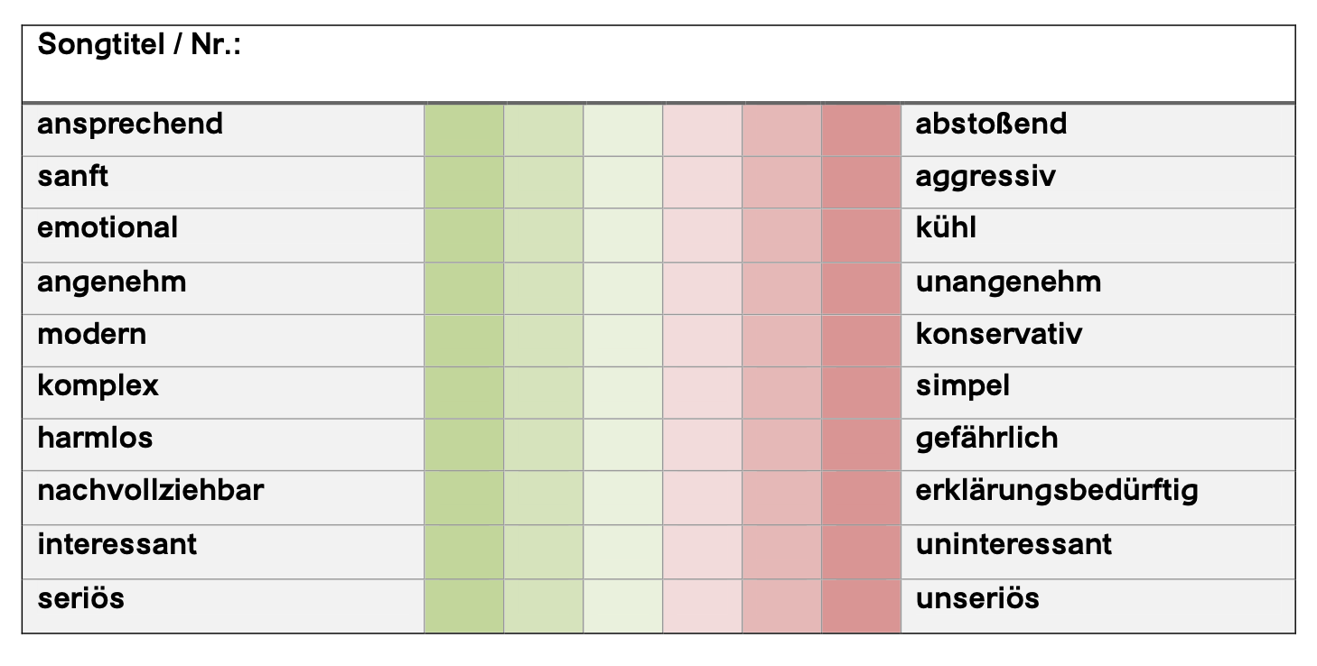 Aufgabe: Hören Sie den Song aufmerksam an. Beschreiben Sie anschließend Ihren Höreindruck durch Ankreuzen im folgenden Polaritätsprofil. Vergleichen Sie Ihre Ergebnisse untereinander.