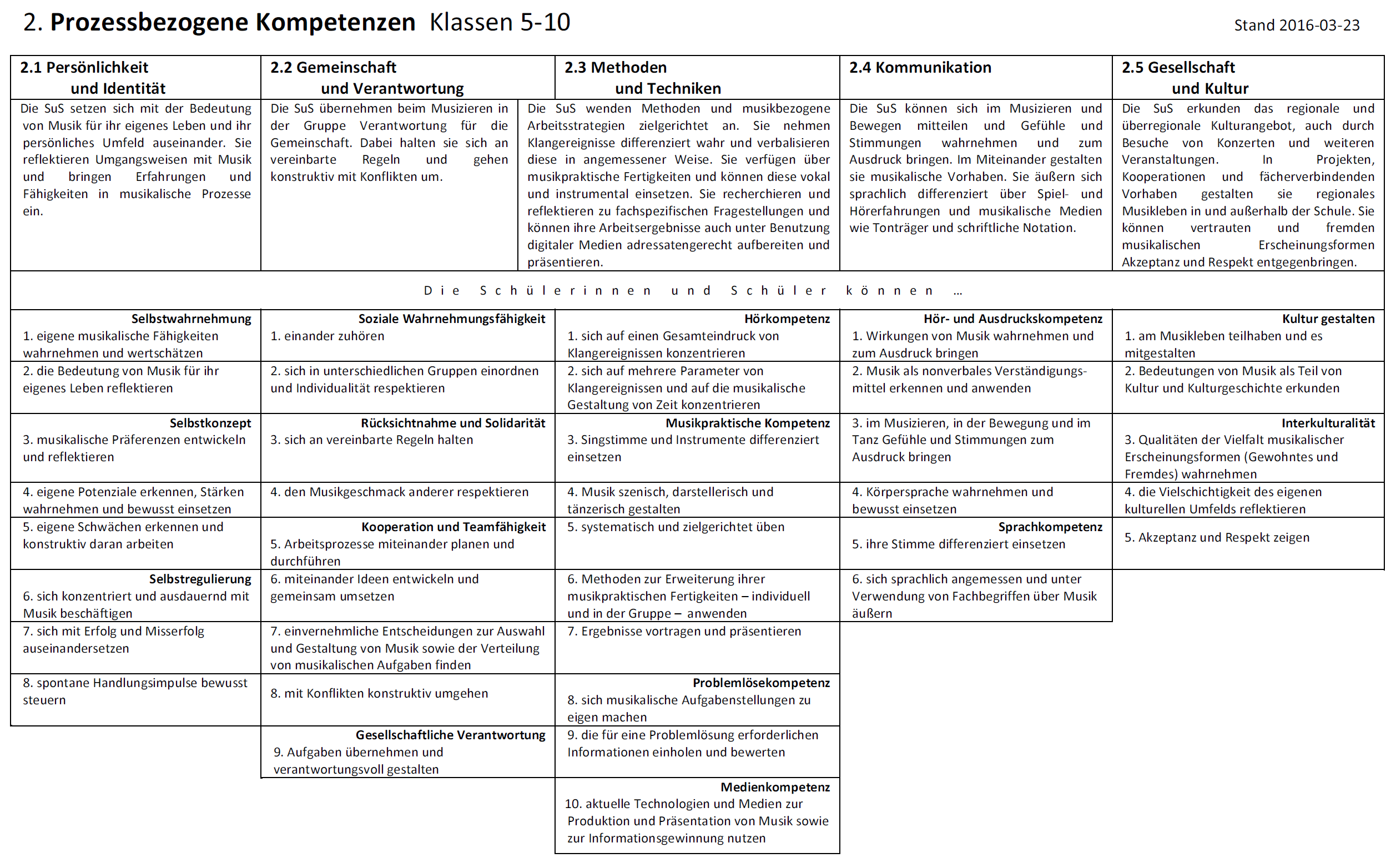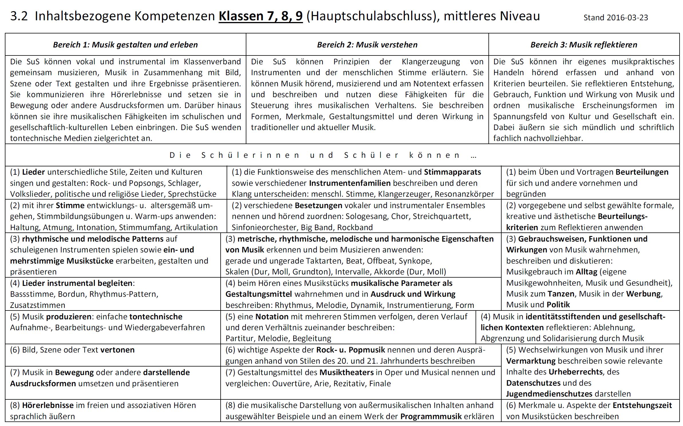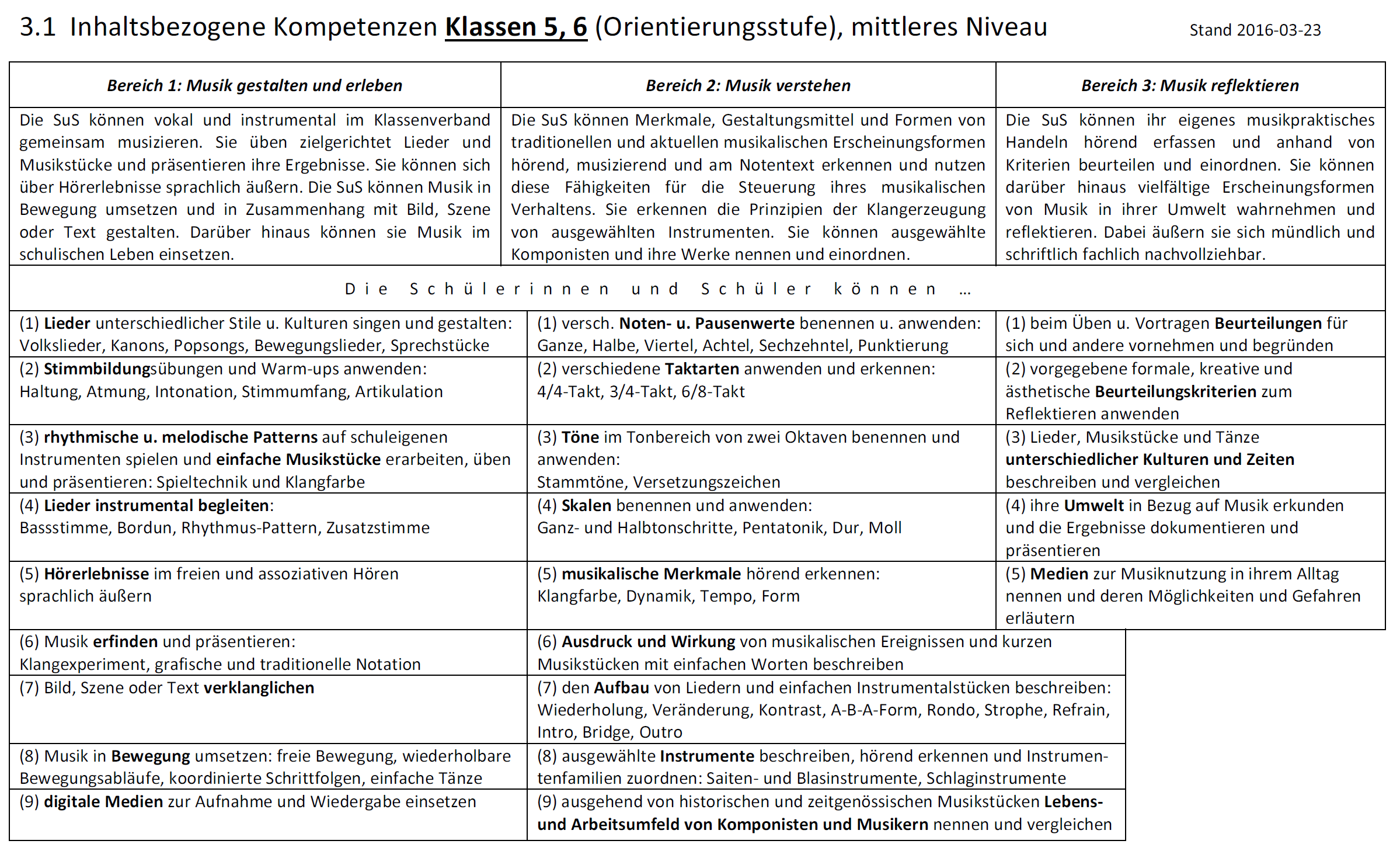 Um im Bildungsplan Musik mit all seinen Verweisen, Hinweisen und den drei Niveaustufen einen einfacheren Überblick zu bekommen, wurden Synopsen erstellt, die alle prozessbezogenen Kompetenzen sowie die inhaltsbezogenen Kompetenzen auf dem mittleren Niveau darstellen. Zur Niveaudifferenzierung, für Hinweise und für Verweise (fachintern, auf andere Fächer, auf Leitperspektiven) ist der Bildungsplan heranzuziehen.