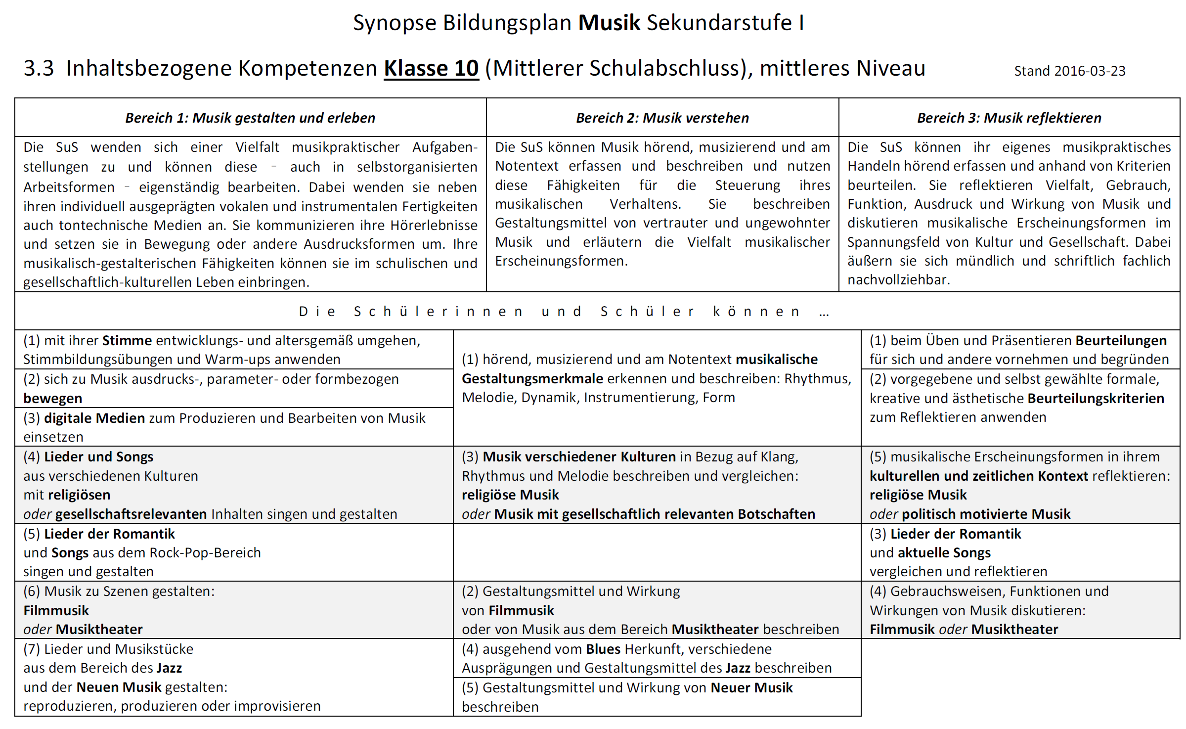 Synopse Bildungsplan Musik Sekundarstufe 1