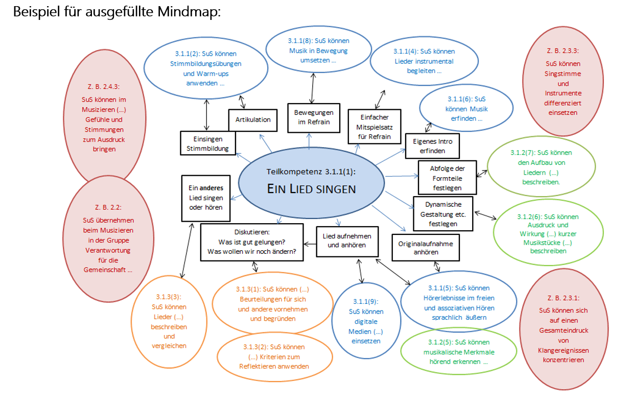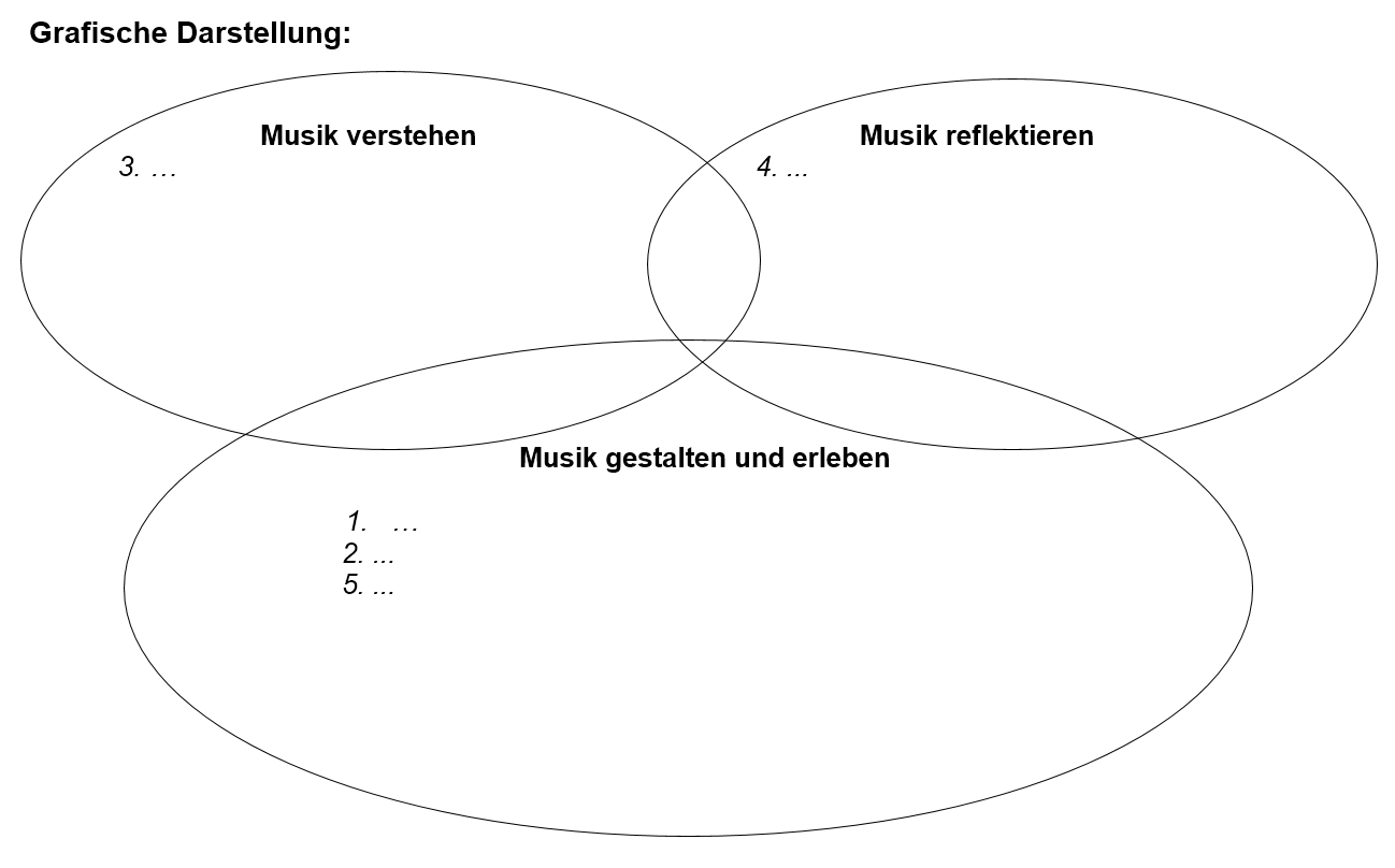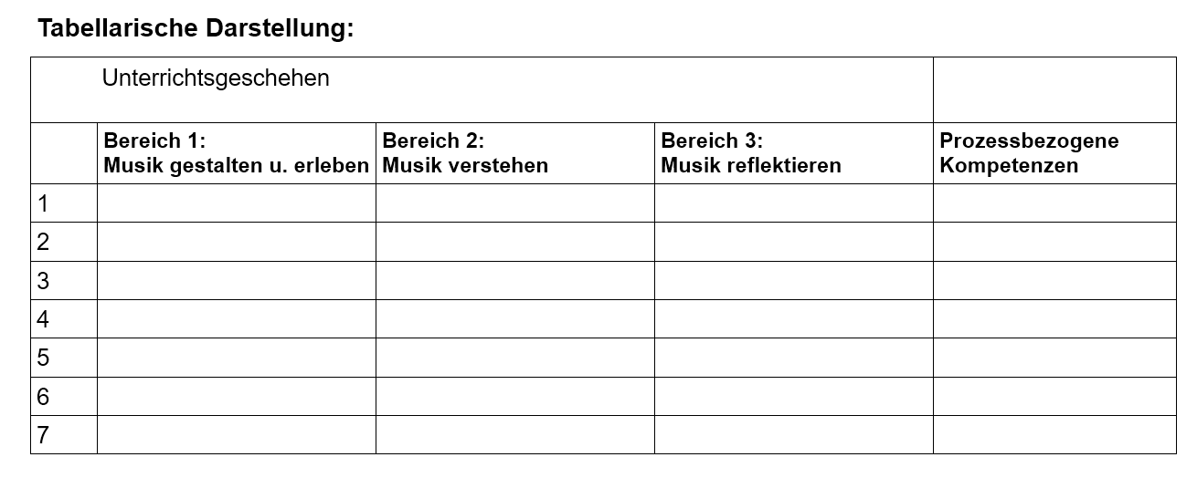 In Unterrichtsituationen im Fach Musik werden grundsätzlich mehrere Teilkompetenzen aus verschiedenen Bereichen verbunden. Im Wechselspiel von „Musik gestalten und erleben“, „Musik verstehen“ und „Musik reflektieren“ entsteht ein ästhetischer Zugang zur Musik (vgl. auch Leitgedanken 1.3 Didaktische Hinweise). Idealerweise werden daher in einer (Doppel)stunde Musikunterricht Kompetenzen aus allen drei Bereichen der Standards für inhaltsbezogenen Kompetenzen sowie der prozessbezogenen Kompetenzen angebahnt. In der alltäglichen konkreten Planung des Musikunterrichts ist es aus Gründen der besseren Übersicht ratsam, ein Planungsraster zu verwenden, das alle Kompetenzbereiche des Faches Musik abdeckt.