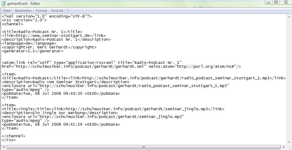 Ein wenig Vorsicht ist geboten beim Eintragen von "tags" über den Texteditor, da XML einige Dinge nicht erkennt, die in HTML möglich sind. Hieraus können Fehler entstehen, sodass der Gesamte Podcast nicht erkannt oder gelesen werden kann. Wichtig ist vor allem, die Spezifikation des Publikationsdatums genau zu übernehmen. Im UTF-8-Code erscheint zum Beispiel das Anführungszeichen " als ". - Eine genaue Schreibanweisung für XML findet sich bei W3C .
