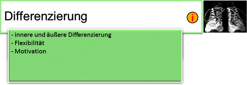 Differenzierung umfasst alle organisatorischen (äußere Differenzierung) und methodischen (innere Differenzierung) Maßnahmen im Sinne einer individuellen und spezifischen Förderung der Schüler. |