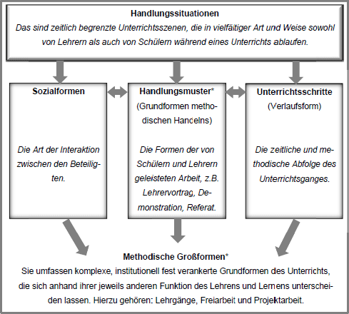 * Die Handlungsmuster, also die Grundformen methodischen Handelns, und die methodischen Großformen lassen sich oft schwer trennen und werden daher bei der folgenden Ausführung zum Begriff Unterrichtsformen zusammengefasst.