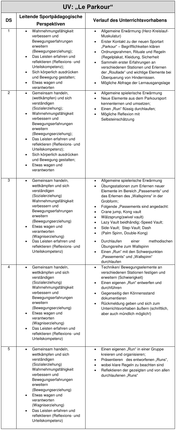 Überblick über den Verlauf des Unterrichtsvorhabens und die leitenden sportpädagogische Perspektiven