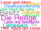 Als Schnelleinstieg finden Sie hier einige Beispiele, wie Liebesgedichte in Wortwolken umgesetzt wurden, jeweils mit (1) und ohne (2) "common words". Den Anfang bilden zwei Lieder: " Anna " (Freundeskreis) ( 1 ) [pdf] [392 KB] ( 2 ) [pdf] [411 KB] und " Alles aus Liebe " (Die toten Hosen) ( 1 ) [pdf] [2,26 MB] ( 2 ) [pdf] [1,62 MB] . Traditionelle Beispiele von Liebeslyrik sind durch Goethes " Willkommen und Abschied " von 1771 ( 1 ) [pdf] [279 KB] ( 2 ) [pdf] [2,29 KB] und durch " Die blaue Blume " ( 1 ) [pdf] [38 KB] ( 2 ) [pdf] [28 KB] von Eichendorff vertreten. Nach Heinrich Heines Gedicht " Lyrisches Intermezzo " ( 1 )[pdf] [74 KB] ( 2 ) [pdf] [54 KB] repräsentieren Bertolt Brechts " Ich will mit dem gehen, den ich liebe " ( 1 ) [pdf] [49 KB] ( 2 ) [pdf] [31 KB] und Erich Frieds " Was es ist " ( 1 ) [pdf] [66 KB] ( 2 ) [pdf] [54 KB] modernere Liebeslyrik. |