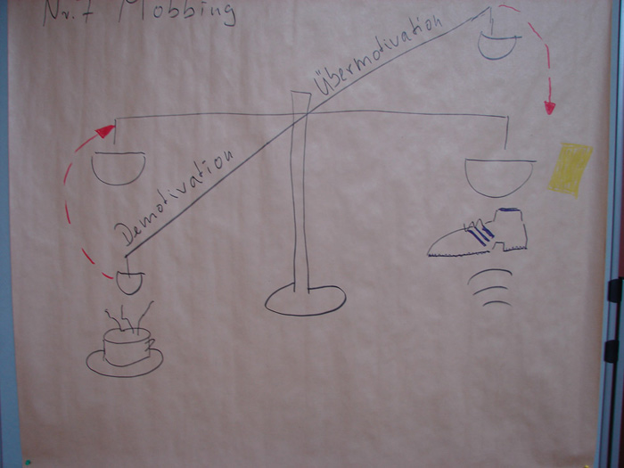 "In einem kerngesunden Unternehmen wurden einige neue Mitarbeiter eingestellt. Nach einigen Wochen der Eingewöhnungszeit kam es zwischen zwei Kollegen, einem neuen und einem seit langem beschäftigten Mitarbeiter, zum Streitgespräch über „die Kaffeepausen". Der seit längerem angestellte Mitarbeiter war wie immer um 10.30 Uhr im Pausenraum einen Kaffee trinken. Als er wieder von der Pause kam, sprach ihn ein Neuling an und sagte zu ihm: „Geht das bei Dir so jeden Tag?“ Darauf antwortete der Pausenhocker: „Das geht dich einen feuchten Kehricht an." Darauf antwortete der Neuling mit einem Grinsen im Gesicht: „Um hier weiter zu kommen, werde ich nicht zögern, Dich bei unserem Meister zu verkaufen!" Darauf verstummte der „Angepisste" und ging weiter zu seinem Arbeitsplatz. Der Neuling hat erreicht, was er will, er hat nun vielleicht eine bessere Stellung bei seinem Meister und mehr Geld, aber der Respekt seines Kollegen ging dabei verloren."