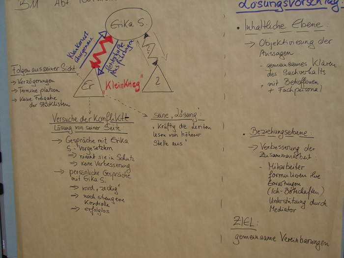 "Vor ungefähr einem halben Jahr hat Erika S. in unserer Abteilung in der Normenstelle angefangen zu arbeiten, seitdem geht in dem Bereich alles nur noch halb so schnell als zuvor, obwohl wir jetzt 3 Personen sind. Ihre Aufgabe ist es Stammsätze und Stücklisten anlegen, Änderungen bearbeiten und Zeichnungsfreigabe. Es gibt mit dieser Kollegin in letzter Zeit immer öfter Probleme, da sie so kleinkariert ist und uns wegen jeder Kleinigkeit die Zeichnungen zurückgibt, wir sie noch einmal bearbeiten müssen und ihr diese noch einmal ausplotten. Deshalb dauert unsere Arbeit länger und wir können fast die Termine nicht einhalten oder die Stücklisten können nicht freigegeben werden, da sie so lange braucht, weil sie jede Kleinigkeit anschauen muss und in Zeichnungen sogar Maße nachmisst, ob diese auch maßstäblich sind. Ein sehr großes Problem ist auch, dass, obwohl wir uns an ihren Vorgesetzten gewandt haben, es bis jetzt keine Verbesserung gibt. Dieser nimmt sie nur in Schutz und meint, dass sie das schon richtig mache. Wenn einer von uns sie darauf anspricht, dann wird sie zickig und die Arbeit von demjenigen wird noch strenger angeschaut oder das Material wird nach unten gelegt, so dass es noch länger dauert mit der Bearbeitung. Es ist wie ein Kleinkrieg zwischen ihr und der Abteilung.