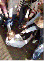 Es wird der Klasse beim Betrachten klar, dass die Intensität der Bilder steigt, je näher die Außenstehenden ins Bild rücken, je klarer die Überlegenheit betont wird. Dies ist eine zentrale Funktion von Groß- und Nahaufnahme in Verbindung mit der Perspektive. Das letzte Bild zeigt zudem die passende bedrohliche Gestik.