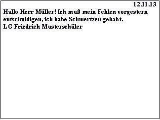 Stellen Sie sich die folgende – aus verschiedenen Beispielen zusammengesetzte und erfundene – Abschrift einer Schüler-Entschuldigung handschriftlich auf einem karierten, gelochten Ringbuchblatt vor. Analysieren Sie sie unter Aspekten der inneren und äußeren Form.