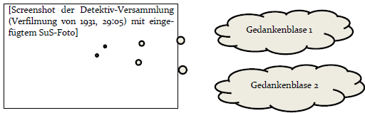 Der Grundgedanke besteht darin, die SuS Fotografien ihres Gesichts anfertigen und in einen Screenshot der drei Verfilmung einfügen zu lassen, der die Versammlung der Detektive zeigt; vorzugsweise sollten die Screenshots aus den Verfilmungen von 1931 und 2001 verwendet werden, weil sie große Unterschiede aufweisen (vgl. auch unten). Anschließend sollen die SuS Gedanken- und Sprechblasen in den Screenshot einfügen und die Handlung aus ihrer eigenen Perspektive (und somit aus der Sicht eines Beteiligten) schildern; eine Anweisung zu diesem Vorgang ist in der Anleitung zu finden. Die gestaltende Interpretationsaufgabe ermöglicht so eine Einfühlung in die handeln den Figuren und ein besseres Verständnis für die Situation, zugleich stellt es eine Schreibübung dar.