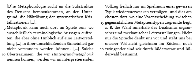 Hans Blumenberg, Paradigmen zu einer Metaphorologie, Bonn 1960, in: Haverkamp, Anselm (Hrsg.): Theorie der Metapher, Darmstadt 21996, 285–315, 290 f.