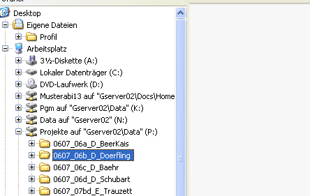 - das Laufwerk: Projekte auf „Gserver02\Data\“ (P:) . Wenn ihr auf das Pluszeichen links vom Symbol des Netzlaufwerks P: oder auf das Symbol selbst klickt, seht ihr alle Projekte des laufenden Schuljahrs. Ihr klickt anschließend auf euere Klasse (z.B. hier im Bild: [0607_06b_D_Doerfling]) und seht rechts die darin enthaltenen Ordner.