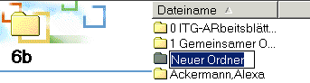 Der neue Ordner erscheint auf der rechten Seite des Explorer-Fensters unter allen anderen Dateien. Solange noch der Rahmen um den blau unterlegten Namen „Neuer Ordner vorhanden ist, kannst du einen neuen Namen direkt eingeben : „ Nachname_Vorname “ Sollte der Rahmen schon verschwunden sein, klicke mit der rechten Maustaste auf 'Neuer Ordner' und wähle 'Umbenennen' , der Rahmen erscheint wieder.