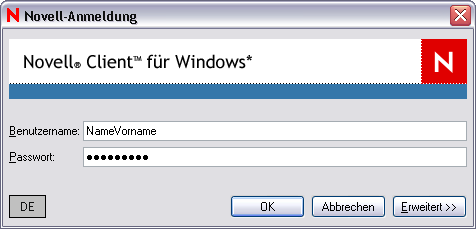Du trägst nun deinen Benutzernamen nach dem Muster „NachnameVorname“ in das obere Feld und dein Passwort (keine Umlaute, kein ß, keine Leerzeichen, kein zu einfaches Passwort wie Geburtstag, Straßennamen, Name des Hundes usw.) in das untere Feld des Fensters „Novell-Anmeldung“ ein. Behalte dein persönliches Passwort für dich und sage es niemandem. Das Passwort wird nur mit Sternchen angezeigt. Wenn zwei am selben Computer zusammenarbeiten, achte darauf, dass dein Mitschüler dein Passwort bei der Eingabe nicht sieht! Bei der ersten Anmeldung lässt du das Passwortfeld frei, klickst auf „OK“ und gibst dir selbst ein Passwort, das du zweimal einträgst. Nach der Bestätigung mit „OK“ meldet dich der Rechner im Schulnetz an.