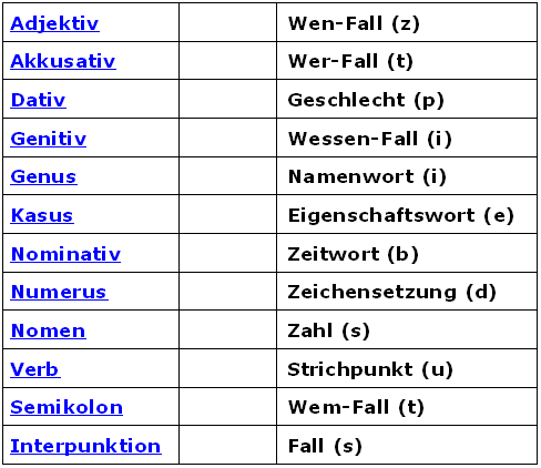 Markiere mit der Maus einen deutschen Begriff aus Spalte 3 und ziehe ihn mit gedrückter linker Maustaste in die Spalte hinter dem dazugehörigen lateinischen Fachbegriff.