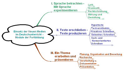 Allen Kollegen und Kolleginnen und Deutsch-Fachschaften wurde bis zum Schuljahr 2003/4 die Gelegenheit gegeben, eine modular aufgebaute 3-tägige Fortbildungsreihe zu besuchen - oder ein FortbildnerInnen-Tandem an die Schule zu holen. Die Konzeption der Fortbildungen geht davon aus, dass der Einsatz der neuen Medien vom Lehrplan her geboten ist, die Selbsttätigkeit der SchülerInnen unterstützt und ein wichtiger Beitrag zur Lesekompetenz, zur Schriftsprachenkompetenz, zur kreativen, ästhetischen und zur kognitiven Kompetenz beiträgt.