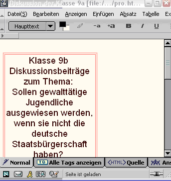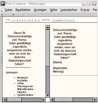 Sobald eine der Dateien (1.htm, 1contra.htm ... von einer Schülergruppe bearbeitet wurde, kann sie durch Anklicken des betreffenden Links ( 1 , 2 ...) gelesen werden.