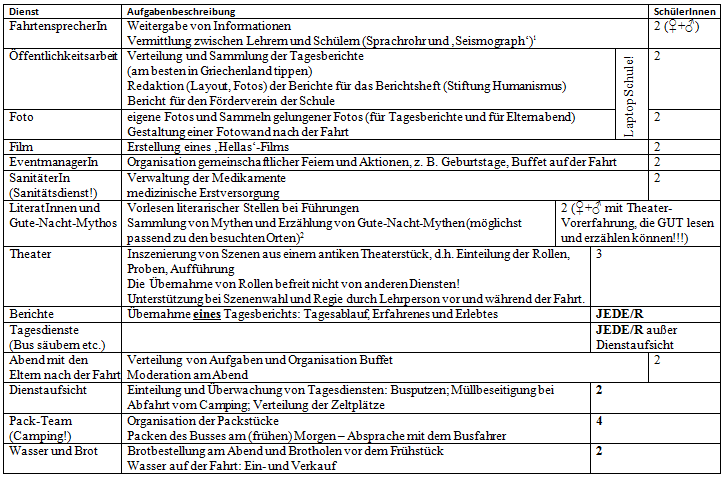 1 Die Aufgaben sind denen von KlassensprecherInnen vergleichbar: Beispielsweise nehmen die FahrtensprecherInnen Wünsche der Gruppe zu Einzelheiten des Programms auf, führen Abstimmungen darüber durch und vermitteln das Ergebnis an die LehrerInnen; sie informieren diese über Konflikte innerhalb der Reisegruppe oder auch individuelle Probleme von MitschülerInnen etc.