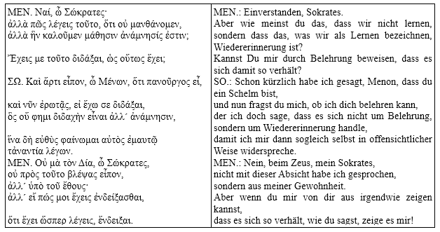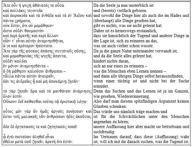 Sokrates‘ Gesprächspartner Menon möchte wissen, ob die Tugend lehrbar sei. Sokrates bringt ihn jedoch zu dem Eingeständnis, gar nicht zu wissen, was Tugend überhaupt sei. Da auch Sokrates dieses Wissen nicht für sich beansprucht, fragt Menon, auf welche Weise Sokrates nach etwas suchen könne, von dem er gar nicht wisse, was es sei: Καὶ τίνα τρόπον ζητήσεις, ὦ Σώκρατες, τοῦτο, ὃ μὴ οἶσθα τὸ παράπαν ὅ τι ἐστίν;