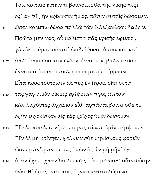 | 1 | Bei diesem Textausschnitt aus den Ὄρνιθες handelt es sich um einen Teil der Parabase II. Erläutern Sie die dramaturgische Funktion des Strukturelements der Parabase im Gesamtkontext einer alten attischen Komödie. |