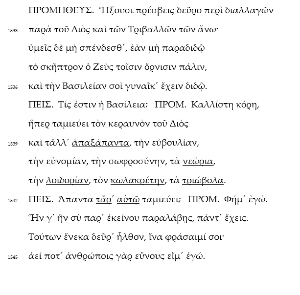 Prometheus: Es werden Gesandte hierher kommen wegen eines Friedenschlusses von Zeus und von den oben lebenden Triballern. Ihr aber schließt keinen Vertrag, wenn Zeus nicht das Szepter den Vögeln wieder übergibt und die die Basileia zur Frau gibt! [...]