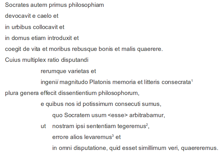 Cuius multiplex ratio disputandi rerumque varietas et ingenii magnitudo Platonis memoria et litteris consecrata1 plura genera effecit dissentientium philosophorum, e quibus nos id potissimum consecuti sumus, quo Socratem usum <esse> arbitrabamur, ut nostram ipsi sententiam tegeremus2, errore alios levaremus3 et in omni disputatione, quid esset simillimum veri, quaereremus.