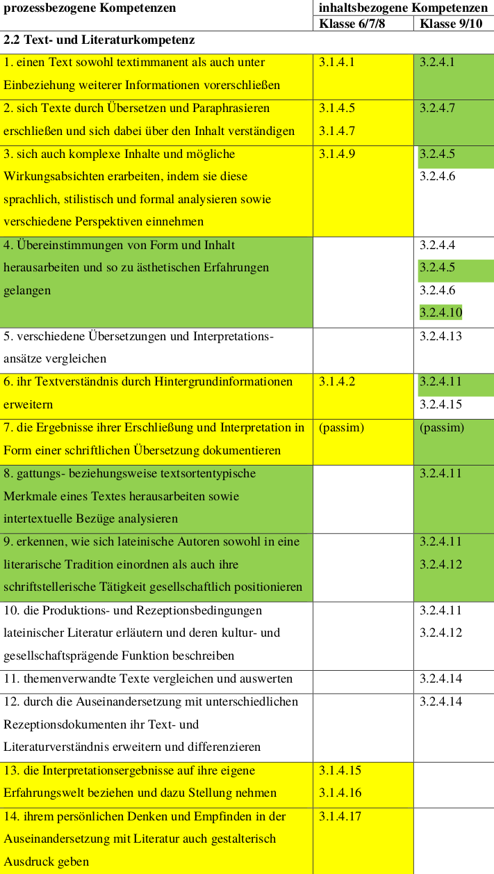 In der folgenden Übersicht sind die Kompetenzen, die in der Spracherwerbsphase erworben wurden, gelb unterlegt, grün die Kompetenzen, die durch die Lektüre der vorgeschlagenen Partien aus den Gesta Romanorum neu hinzukommen.