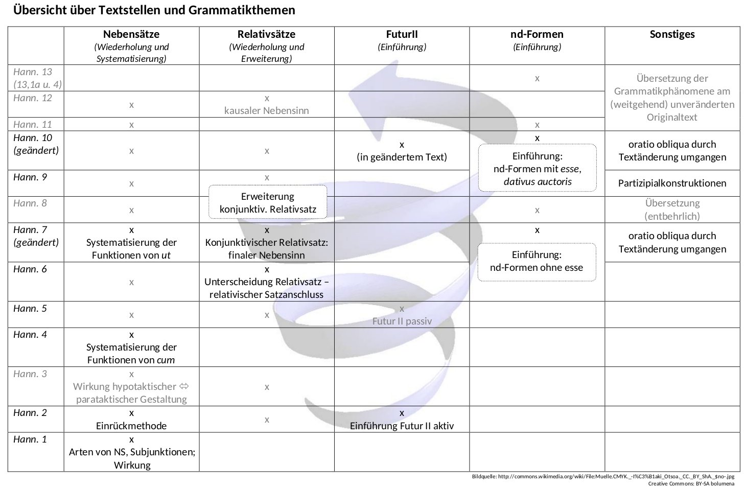 Eine Analyse des Formenbestands und der syntaktischen Phänomene legt für Nepos‘ Hannibal-Vita eine vertiefende Behandlung von sowohl adverbialen Nebensätzen als auch Relativsätzen sehr nahe. Darüber hinaus bieten die Materialien Vorschläge für die Einführung des Futur II und der nd-Formen1.